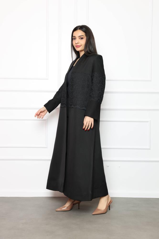 عباية بليزر بتصميم عصري يجمع بين قصة البليزر المحكمة وتفاصيل الدانتيل الأنيقة. الخيار الأمثل للمرأة السعودية اللي تبي إطلالة واثقة تنتقل بها من الدوام للسهرة بدون ما تغير ملابسها.
